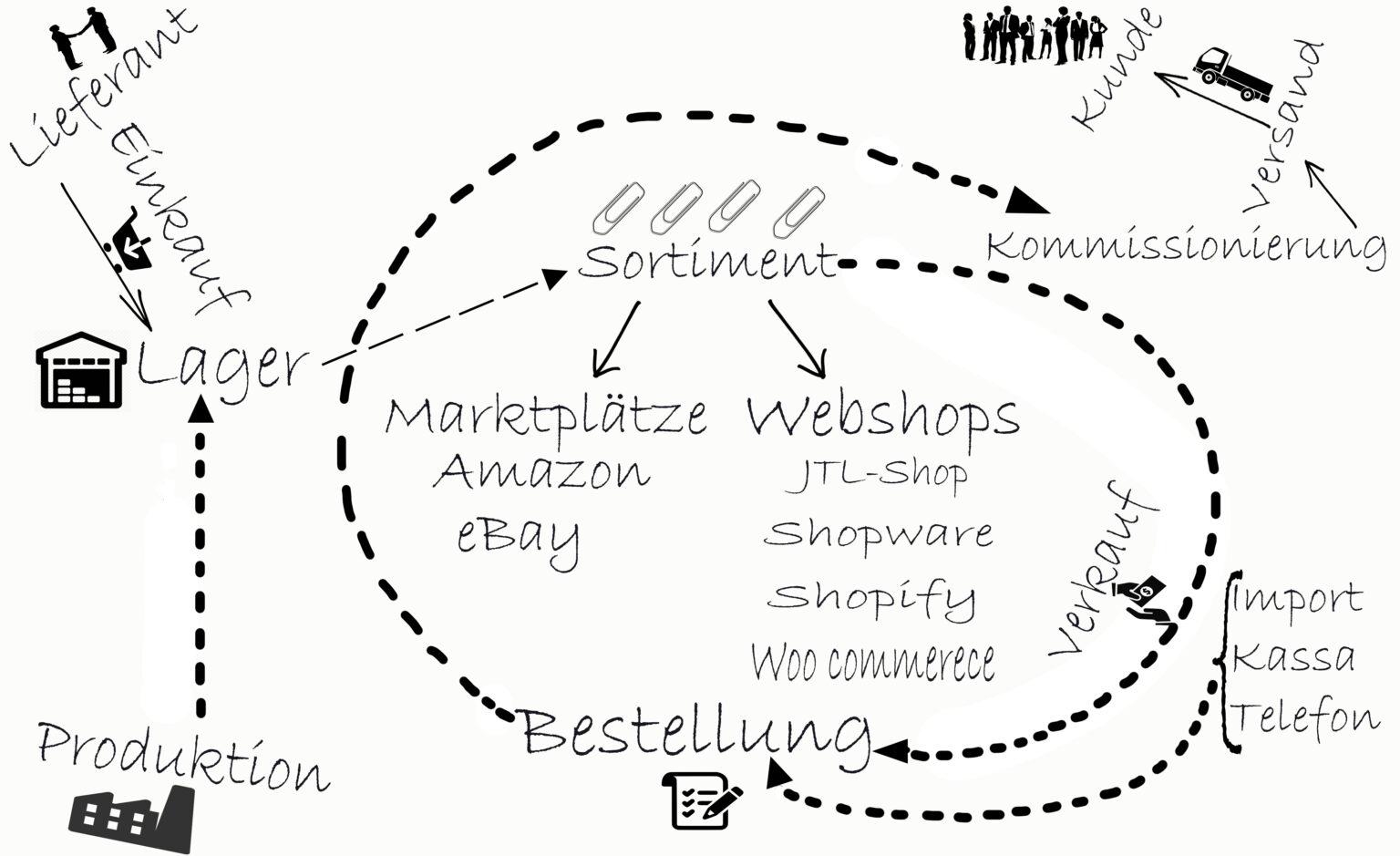Einkauf, Artikelpflege, Angebote, Verkauf und Multi-Channel-Vertrieb, Bestellabwicklung, Zahlungen, Buchhaltungsanbindung sowie Lagerwirtschaft- und Versandorganisation. Im Zentrum steht dabei immer das JTL-Warenwirtschaftssystem.